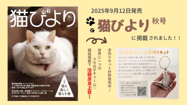 辰巳出版より発売の猫びより2025年秋号に弊社オリジナルグッズの 『うちの子クッションチャーム手作りキット』を掲載いただきました。 自分で作れる小さな家族のもちもちふわふわなかわいいチャームを是非チェックしてみてくださいね うちの子チャーム – 有限会社ヒカリシルク
